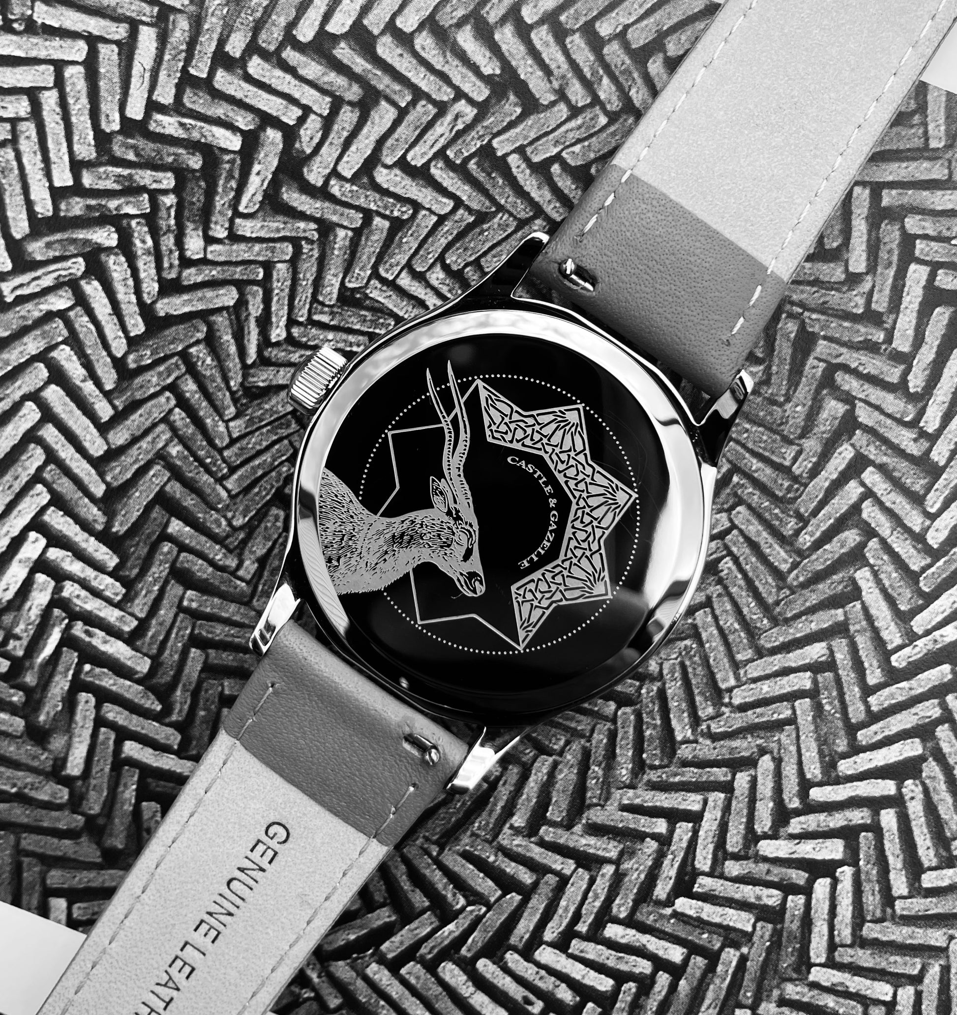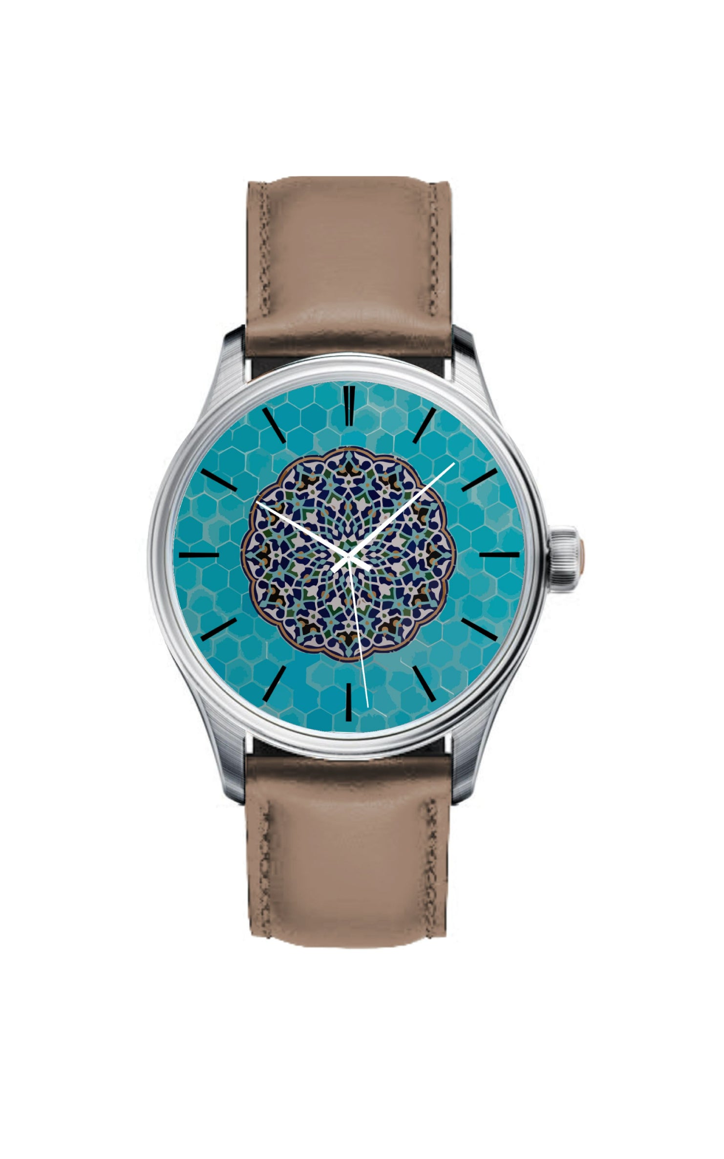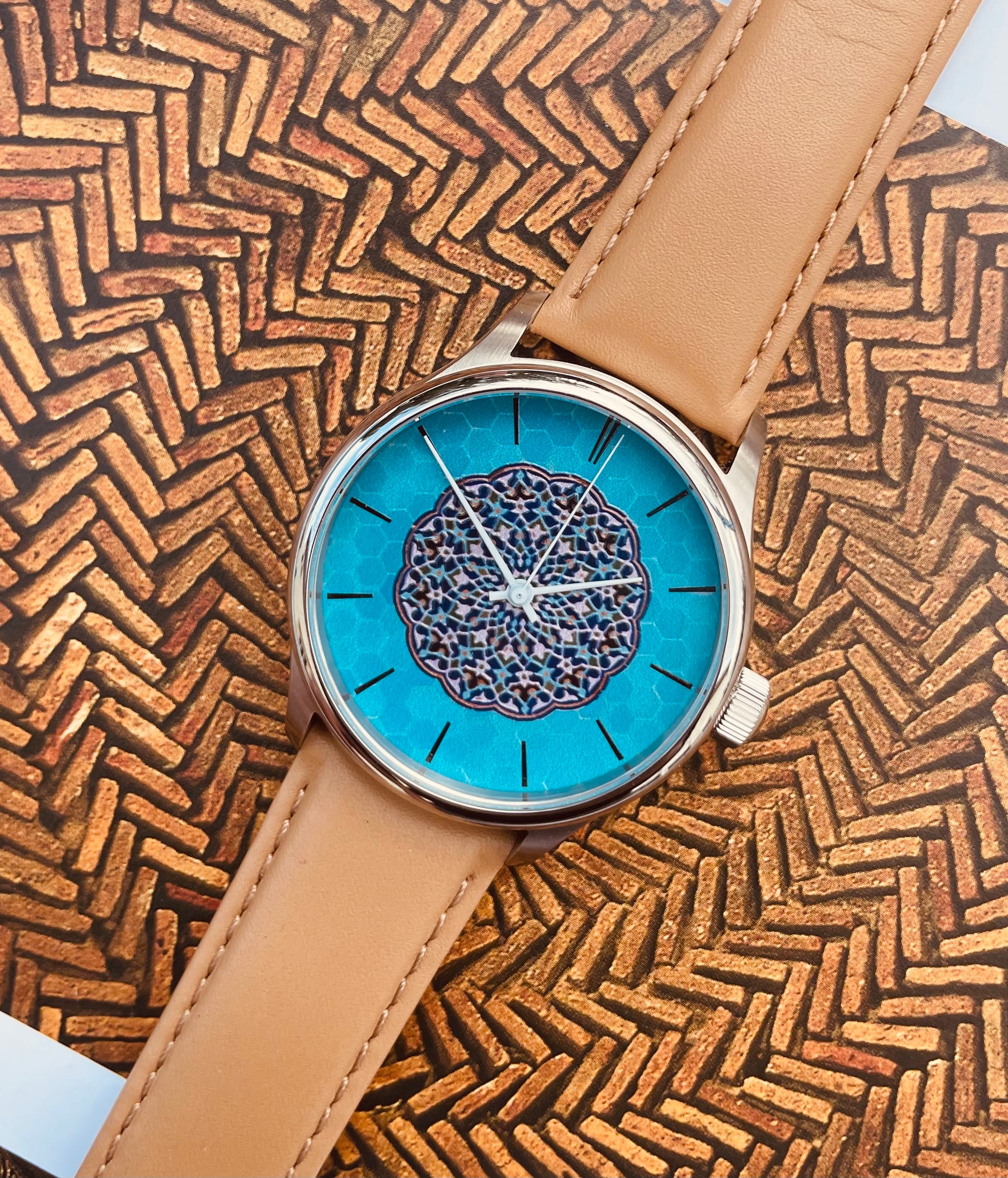 Our beautiful Azure Green features a dial derived from the stunning tilework pattern of the Jameh mosque in Yazd, Iran. A honeycomb of turquoise surrounds a intricate central disc of orange, green, blue and grey. Thin white hands and black hour marking complete the design.