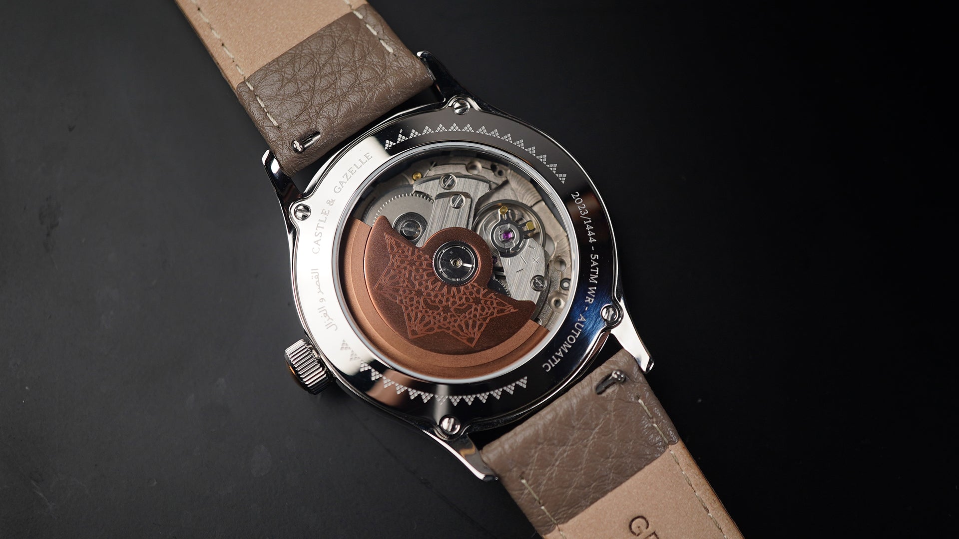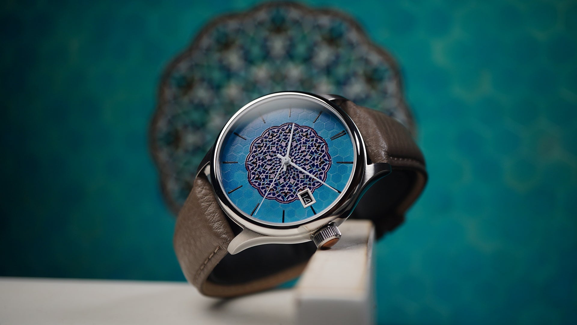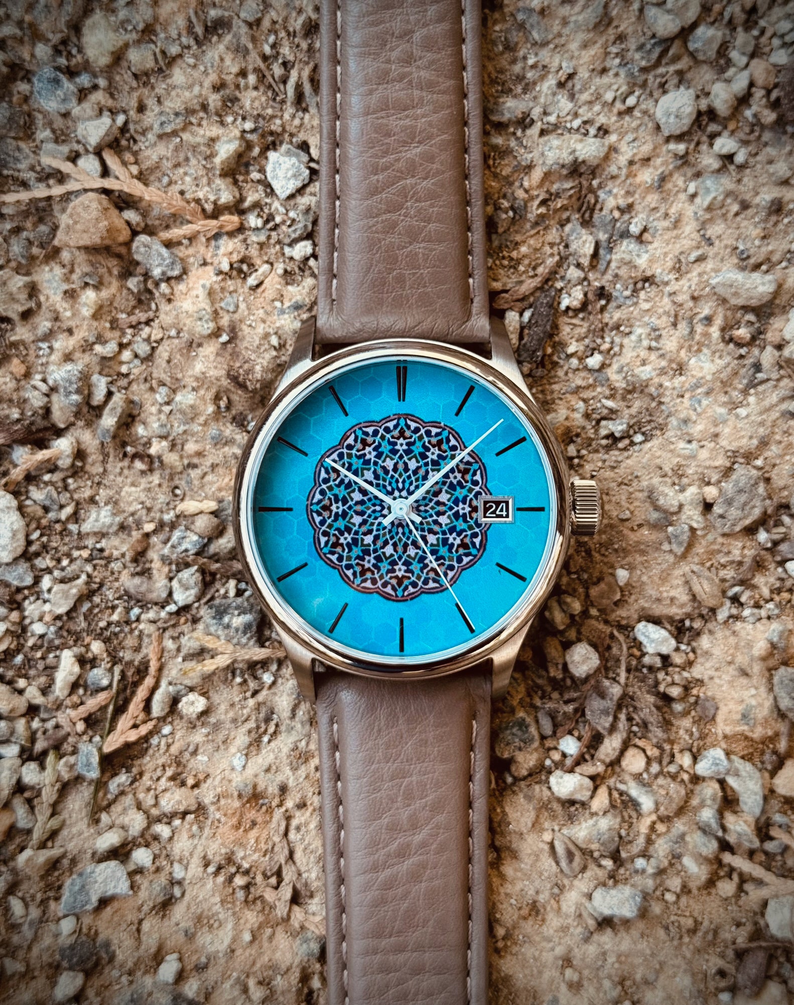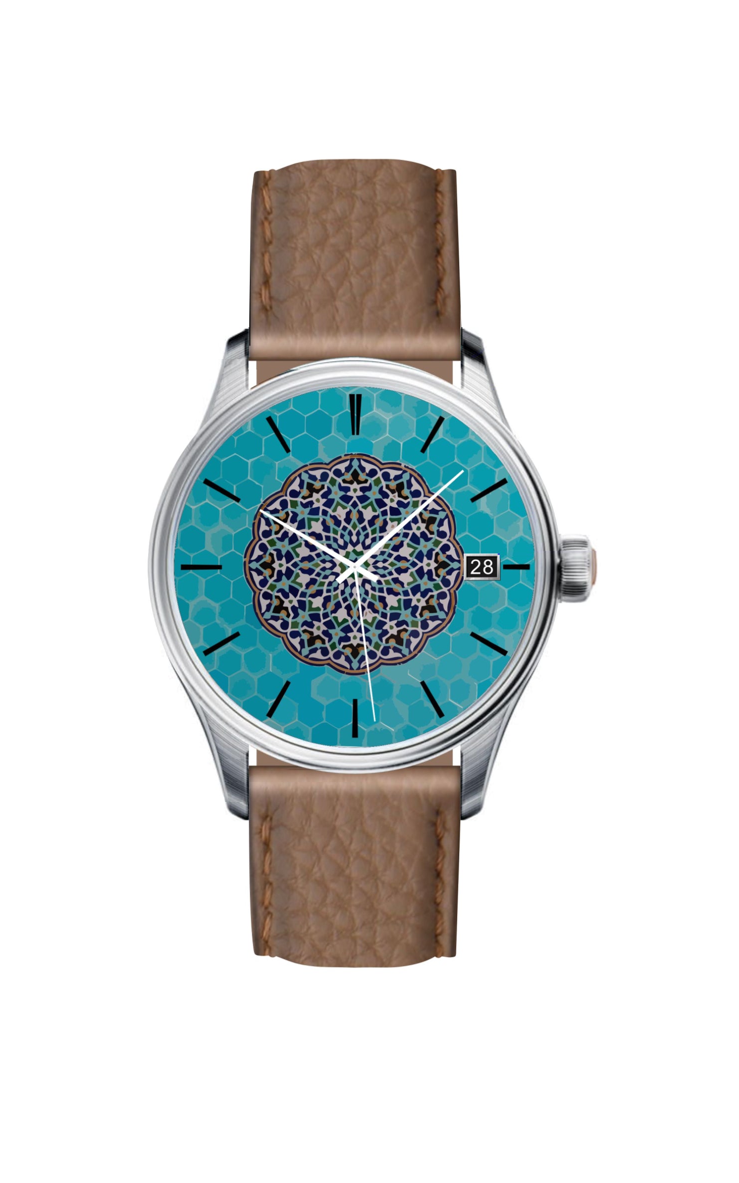 Our beautiful Azure Green is now available in an Automatic mechanical option. This piece features a dial derived from the stunning tilework pattern of the Jameh mosque in Yazd, Iran. A honeycomb of turquoise surrounds a intricate central disc of orange, green, blue and grey. Thin white hands and black hour marking complete the design.