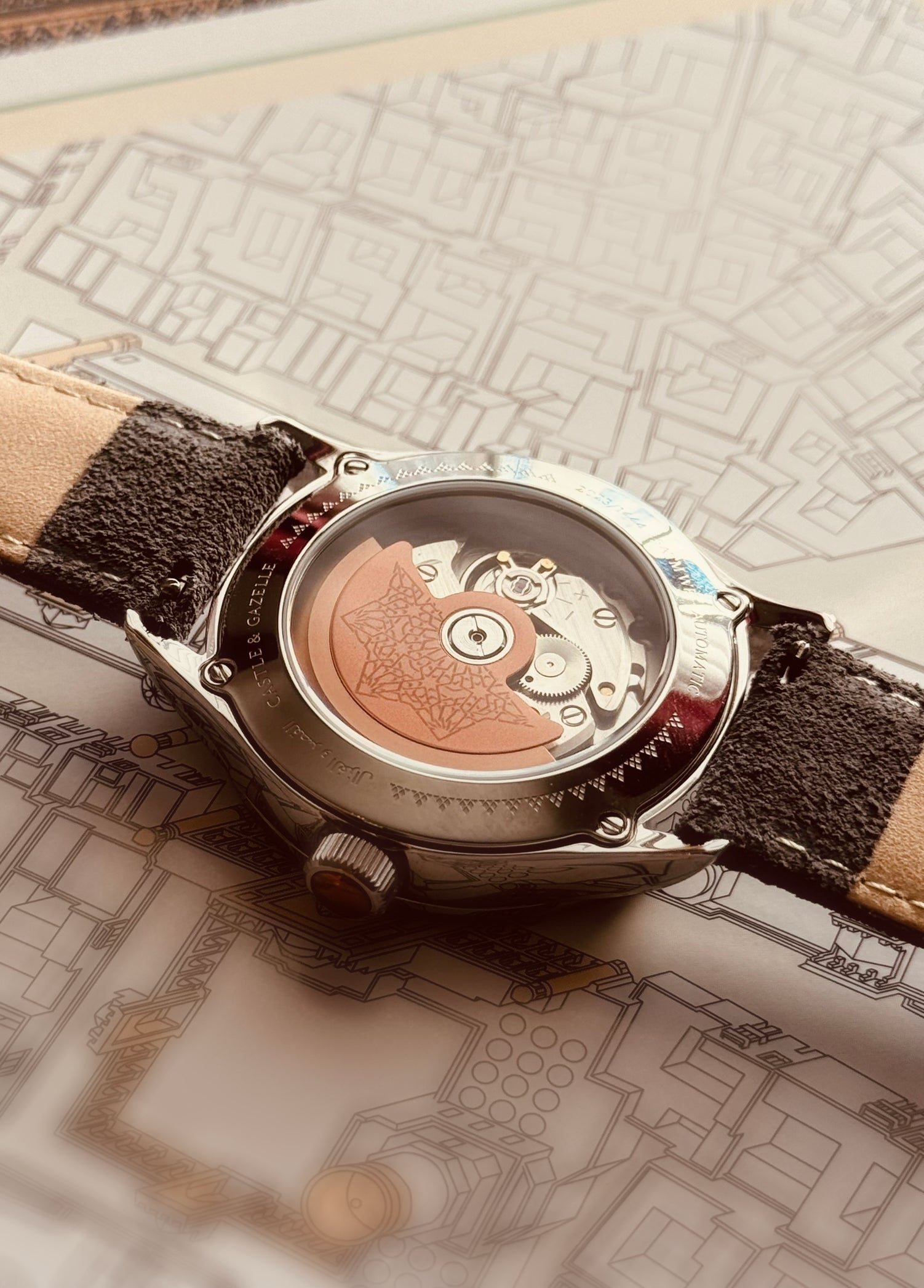 The majestic pattern of the Samarkand Blue is derived from one of the interior domes of the Registan Square in the city of Samarkand, Uzbekistan. The blue-white variegated pattern at the center fades to inky black at the dial periphery. Hands and hour markers in white complete this striking design.