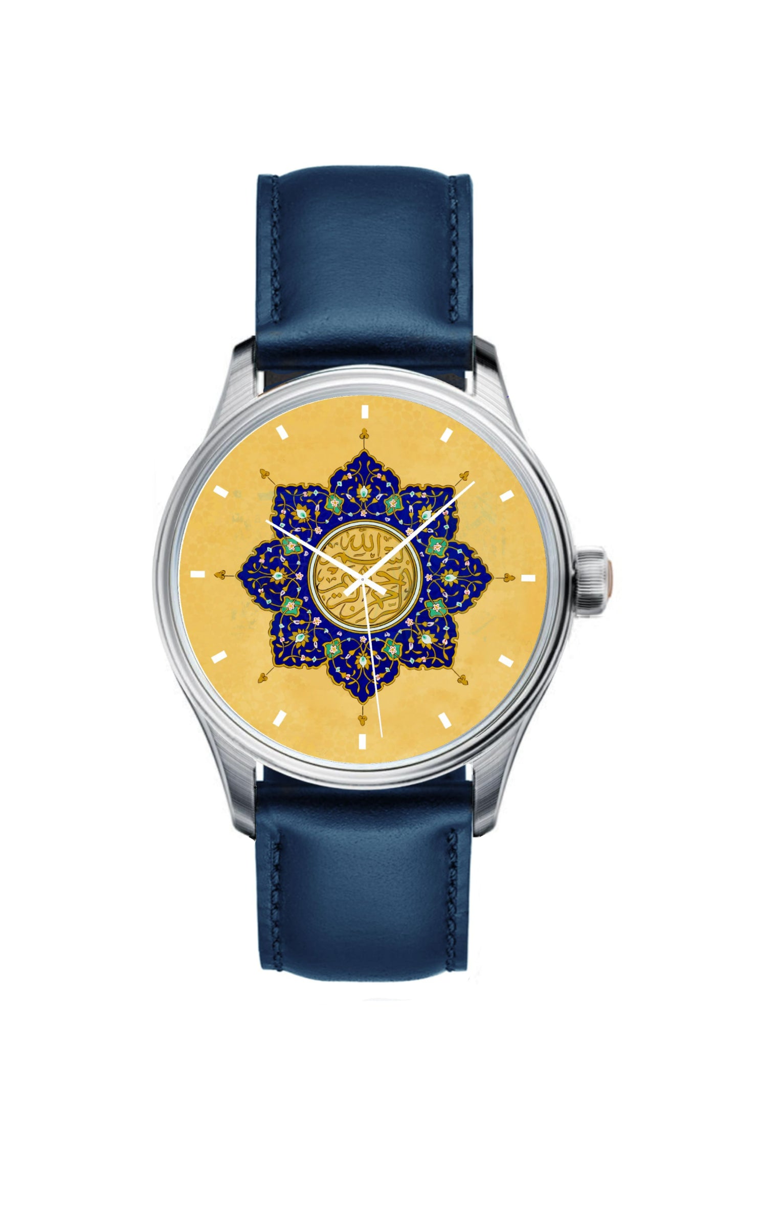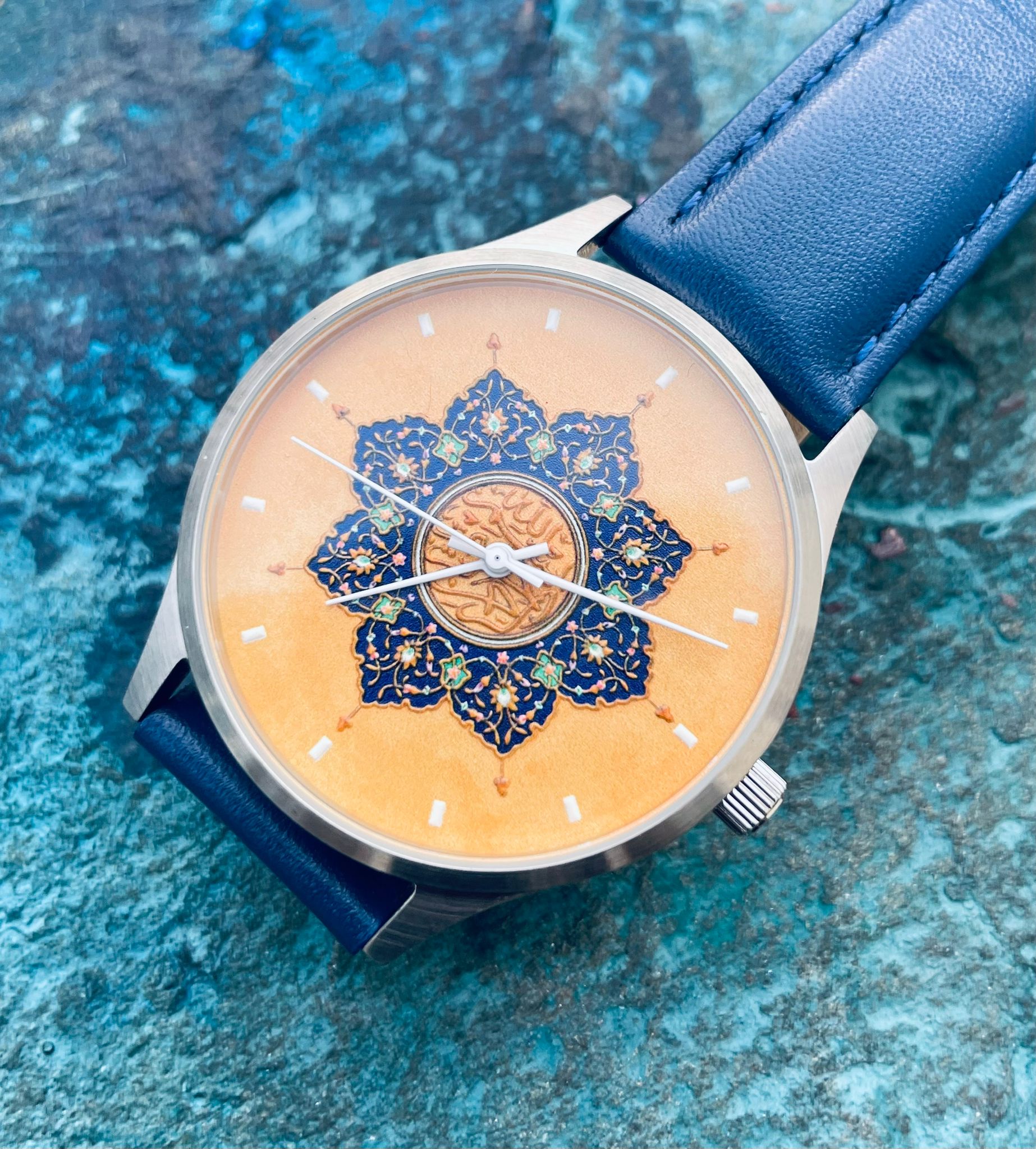 A beautiful watch with an intricately rendered 3D printed dial inspired by the designs from Islamic illuminated manuscripts. A blue sunburst of interwoven botanical patterns surrounds a central Basmala inscription - بِسْمِ ٱللَّٰهِ ٱلرَّحْمَٰنِ ٱلرَّحِيمِ - In the name of God, the most compassionate, the most merciful.