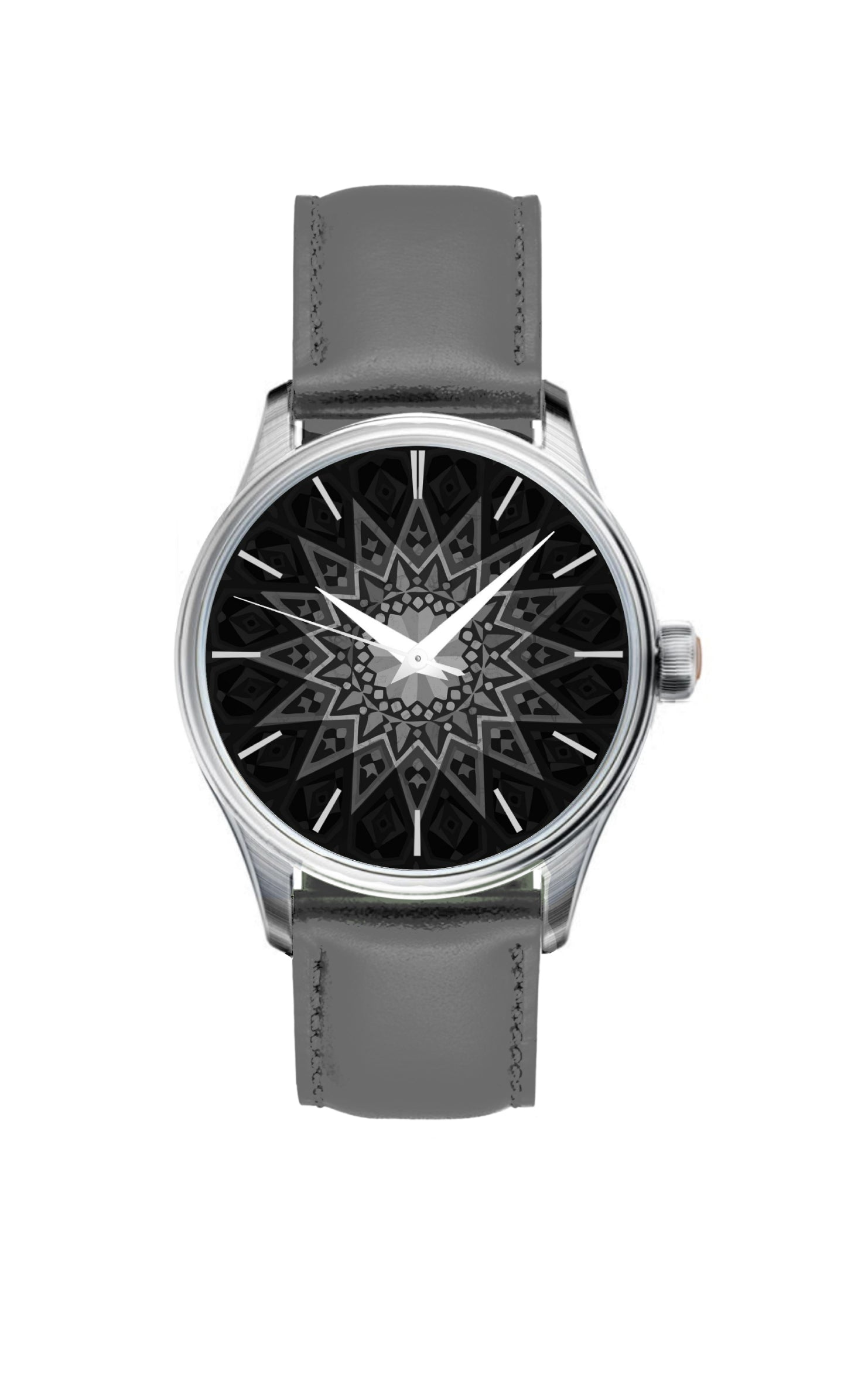 We're happy to offer a stunning black and grayscale variant of our popular Zellij model. The pattern on the beautiful Zellij Moonlight Edition is derived from the stonework of the fountains of the Hassan II Mosque in Casablanca, Morocco. The beautifully rendered 3D printed dial is mean to evoke the serenity and majesty of a moonlit night sky.